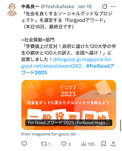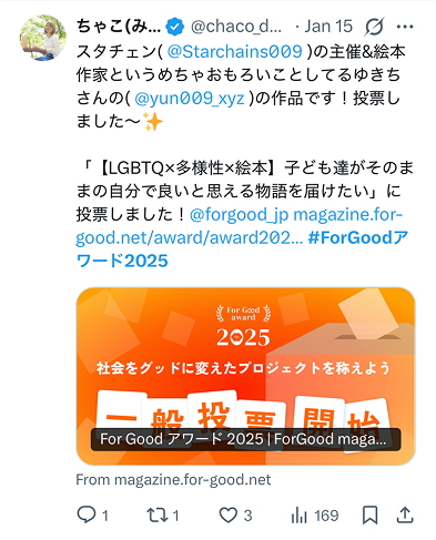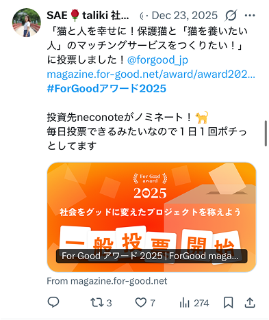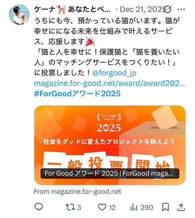 「世界をグッドに。想いをアクションに。」というFor Goodのスローガンを体現する 「社会を良くするソーシャルグッドなプロジェクト」を選定することで、