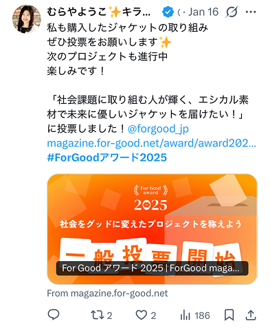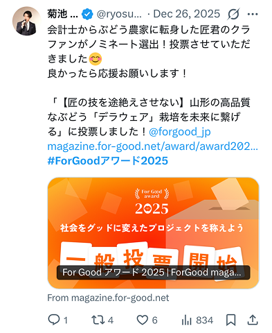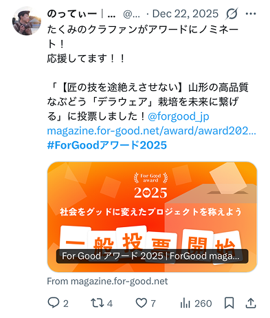 2025年の支援者の中で、特に幅広いプロジェクトを支援してくださった方に贈られる賞です。